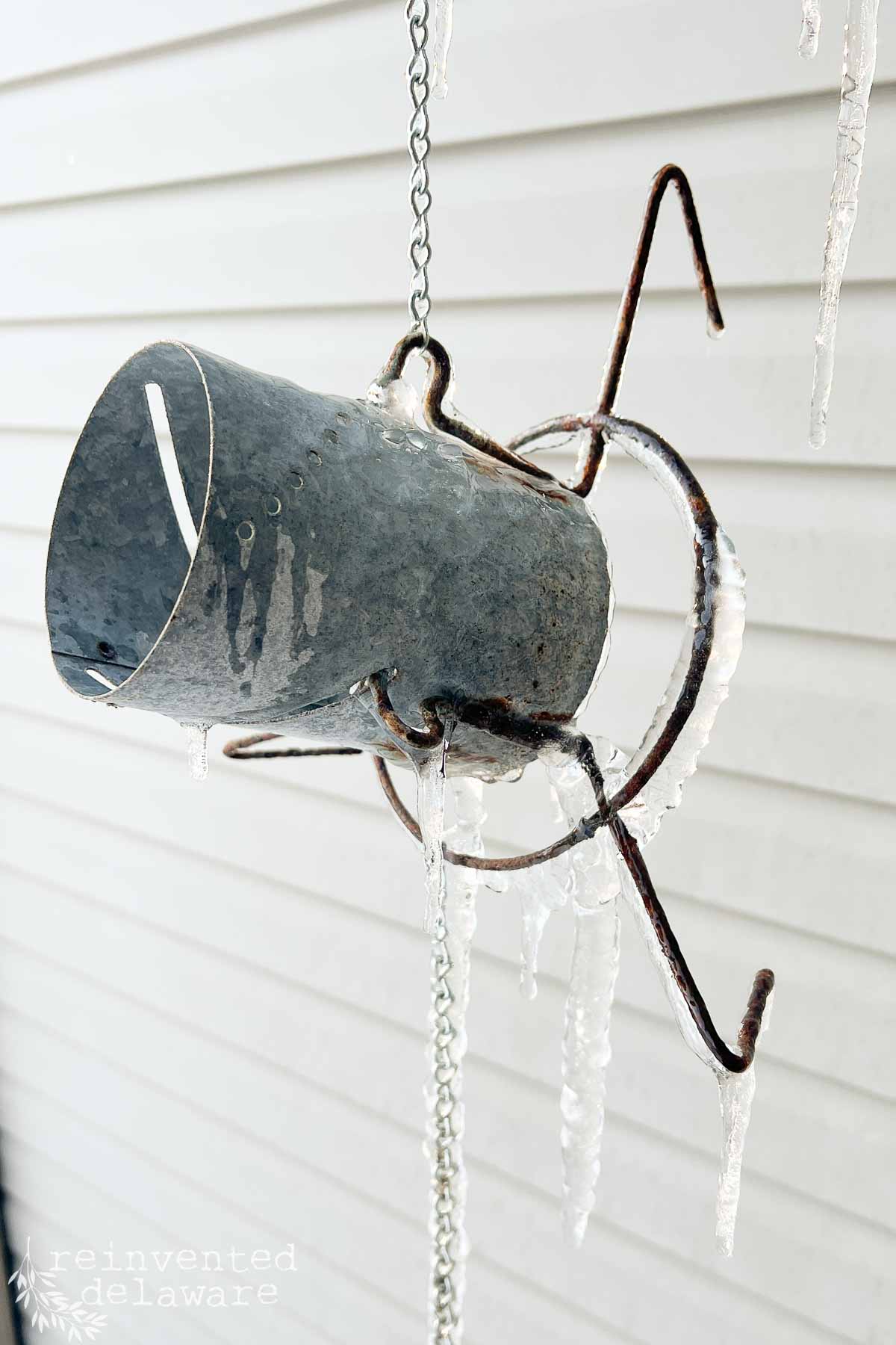 Let me first say, don’t mind the icey image you see below! I forgot to take the photo of the center section when I made this diy hanging planter so I grabbed a photo in the middle of winter! I will show you what I did with those center sections when the temps warm up outside! You will love that project!