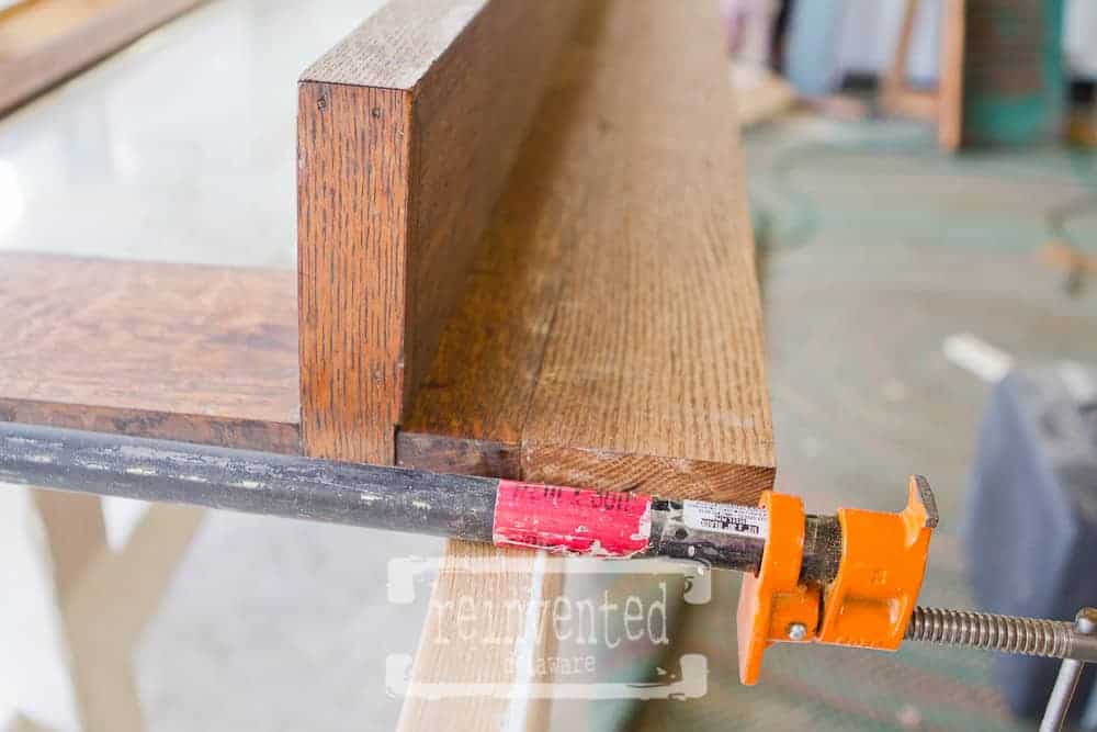 Can you see the line that runs the length of the board about an inch under the shelf? You can really see the line if you look just above the red label on the bar clamp. My husband had an oak piece of wood about 4″ wide and long enough to run the length of the mirror. Boom! Problem solved.