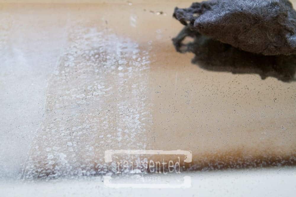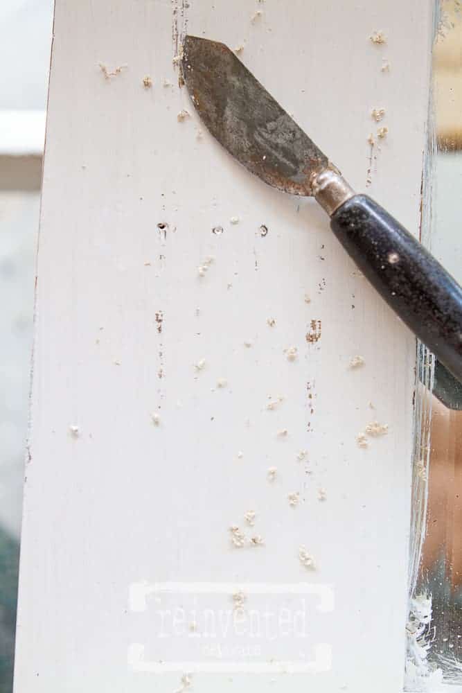 While I worked out the plan in my mind of how to use this near our entry way, I started to clean it. I decided to tackle the mirror first. Windex was not going to clean the gunk that had built up over the years. A straight razor blade and an X-acto knife scraped off a lot of the rough spots. Then #0000 steel wool brought out the beauty of the glass. I used a shop vac to get rid of all of the bits that I scraped and polished off. Be careful if you ever need to use a razor blade and X-acto knife. They are generally pretty sharp. Even the steel wool can cause some damage to you hands. Were gloves and a dust mask – the fibers and dust can be in the air as you are using the steel wool.