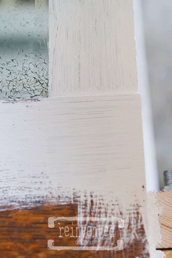 I am not a perfectionist when it comes to applying paint for the simple reason I want my painted pieces to have a do-it-yourself appearance. I like the feel of some imperfections in my painting but I do paint with the grain. That being said, I pay close attention to the areas of a piece that meet up with a section of wood that runs in a different direction. You can see below this kind of area. I paint with the direction of the grain but I am careful to clean up the edges.