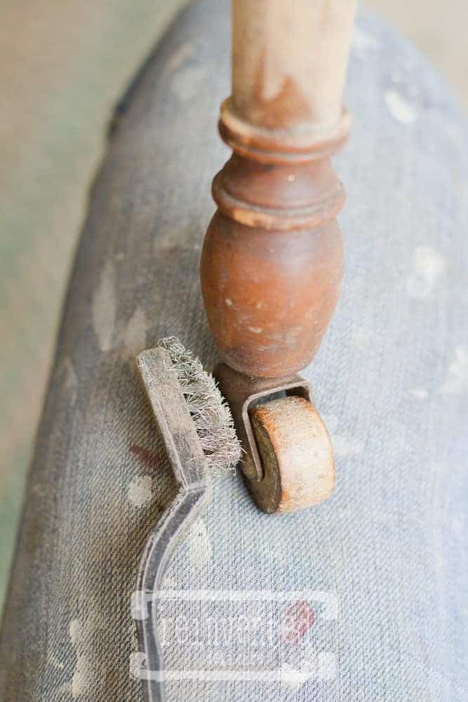 Take a look at those casters!! Wooden wheels steel my heart! Use the wire brush to give them a good cleaning. Also, after you have vacuumed them, you can apply painters tape on the metal part and the wheel. That way you won’t get any paint on them. I am not that patient so I just kept moving forward 🙂