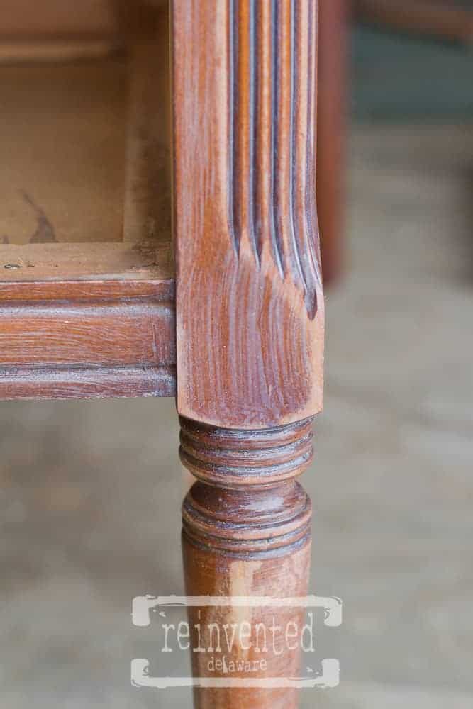 The vanity has this beautiful grooved detail on the top of both front legs. Keep in mind that the paint is thin and could run down those grooves. Just keep checking it and going back over it with the chip brush. It will eventually stop running as it dries. If you don’t get all of the runs as they are happening and the surface is dry, you can lightly sand them and go back over it with paint. It is just easier to keep an eye on it as you are painting.