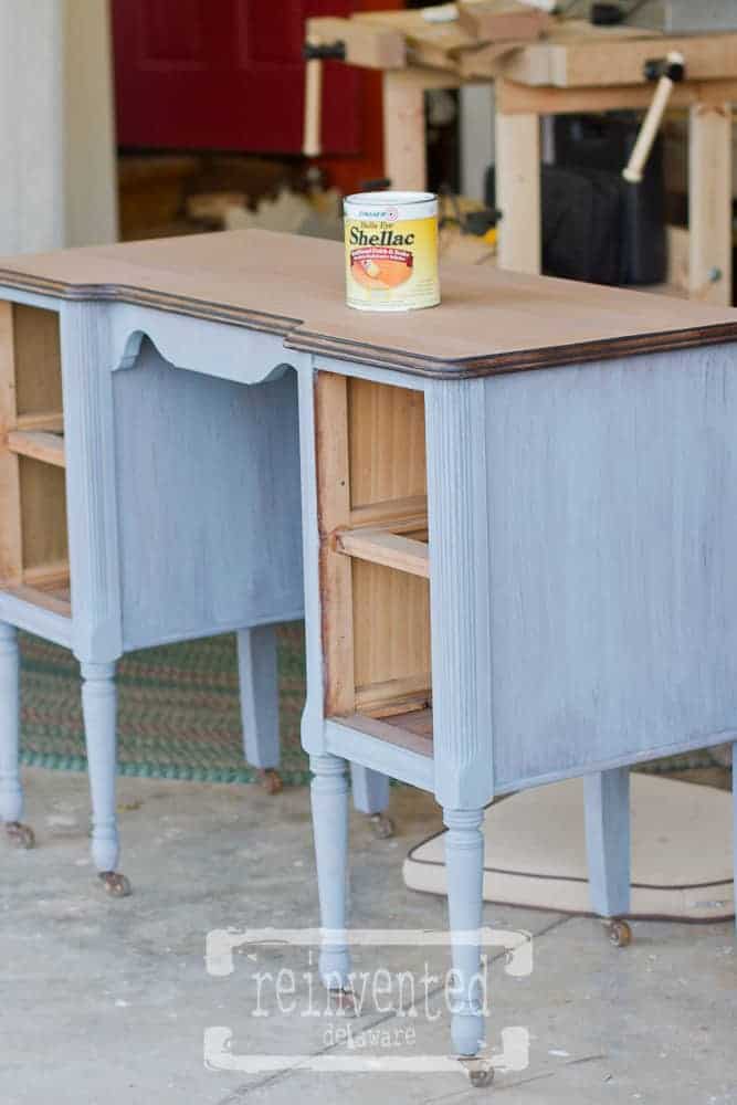 Well here is when things got a little tricky. After the first coat of paint, I realized that the sanding sealer did not create enough of a barrier in preventing the old finish from coming through the paint. I have used this product many times before with success but for some reason, it just didn’t cut it on this piece. I asked my hubby who has also had lots of experience with refinishing old pieces, and he recommended Shellac. So off to Ace we went!