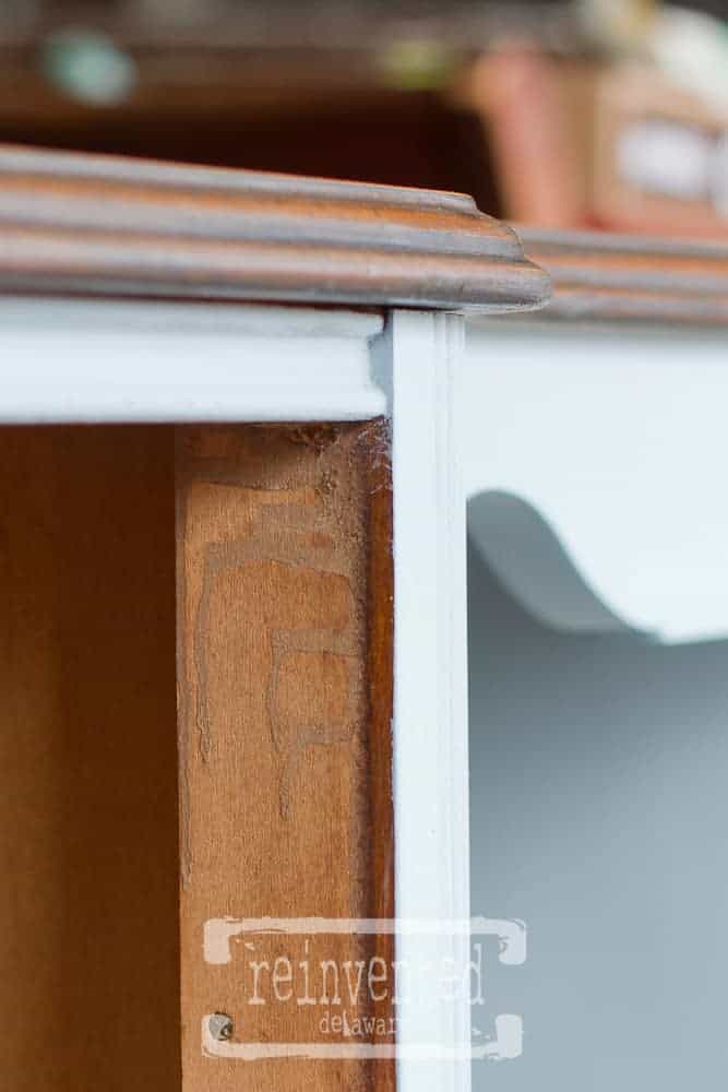 I like to take the extra step and clean up any messy edges that can happen with a paint brush. See inside where the drawer slides in? A little bit of sand paper will take care of it. Take the time to do this step, it will add a more polished and professional look to the finished piece.