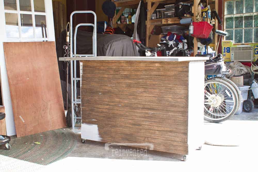 I fell in love with that idea! I had already stripped off the existing finish and sanded down the top of the buffet but we knew that would not be a suitable top for a kitchen island that would get lots of use. At least I had some time to think and plan while I sanded ;).