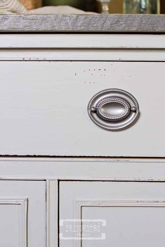 Here are some of the lovely details of this buffet turned kitchen island. Lovely distressing…